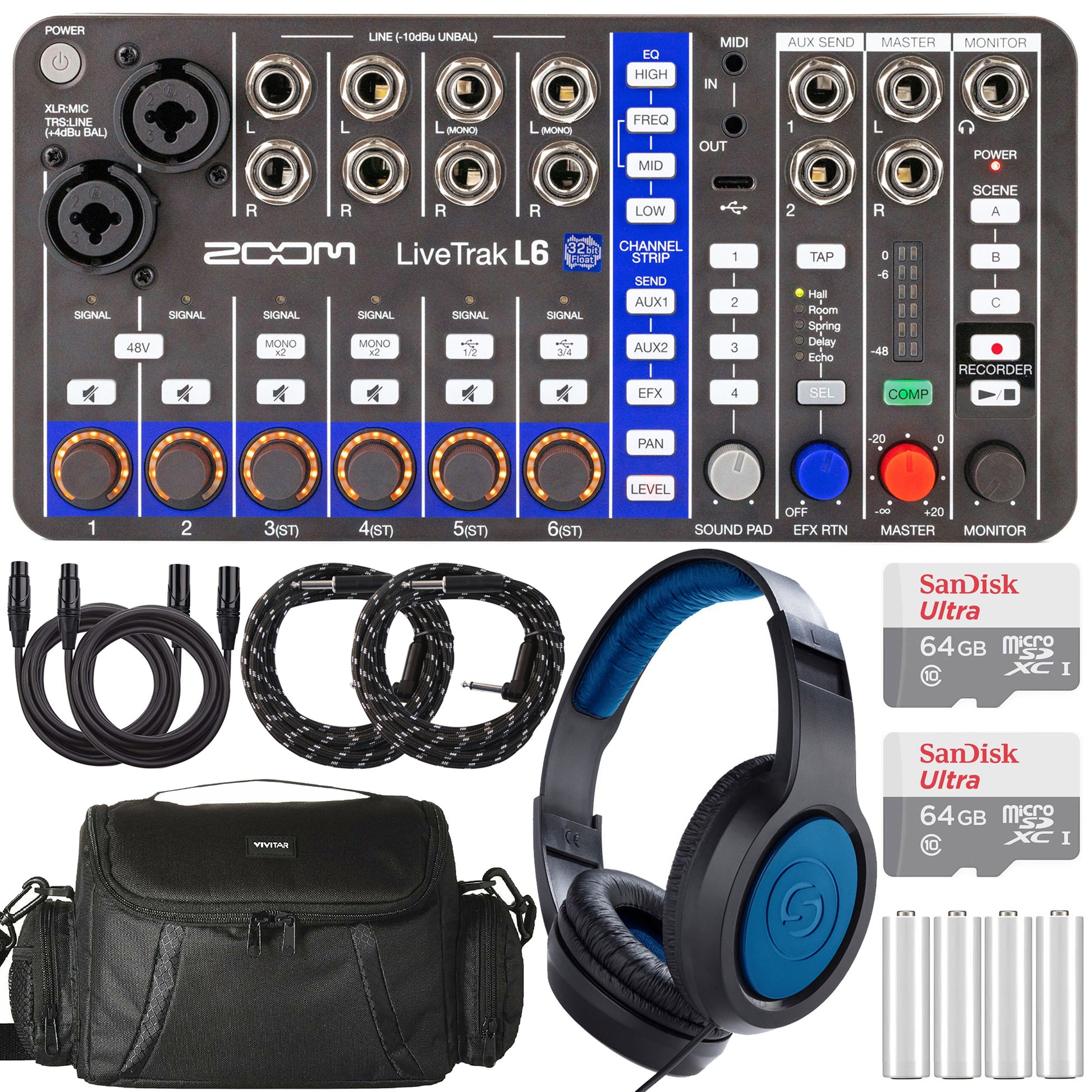 ZOOM LIVETRAK L6 10-TRACK DIGITAL MIXER / RECORDER + 2X STRUKTURE INSTRUMENT CABLE 10FT. RIGHT ANGLE (BLACK/SILVER) + 2X PIG HOG 8MM XLR 3FT FULLY BALANCED PREMIUM MIC CABLE + SAMSON SR350 OVER-EAR STEREO HEADPHONES + GADGET BAG + AA BATTERIES